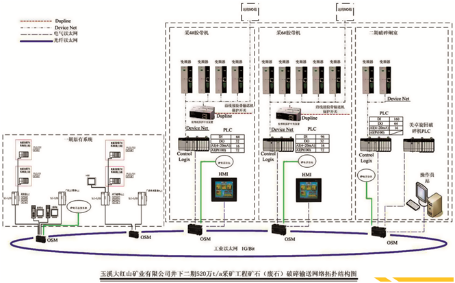 The electrical transmission control system of belt conveyor of Dahongshan iron mine. The belt conveyor in phase-I Dahongshan iron mine project is the longest belt conveyor system under the shaft in China so far; the belt conveyor system in phase-II Dahongshan iron mine project has adopted the Dupline switches and detectors for the protection of belt conveyor, which are beneficial for production management.